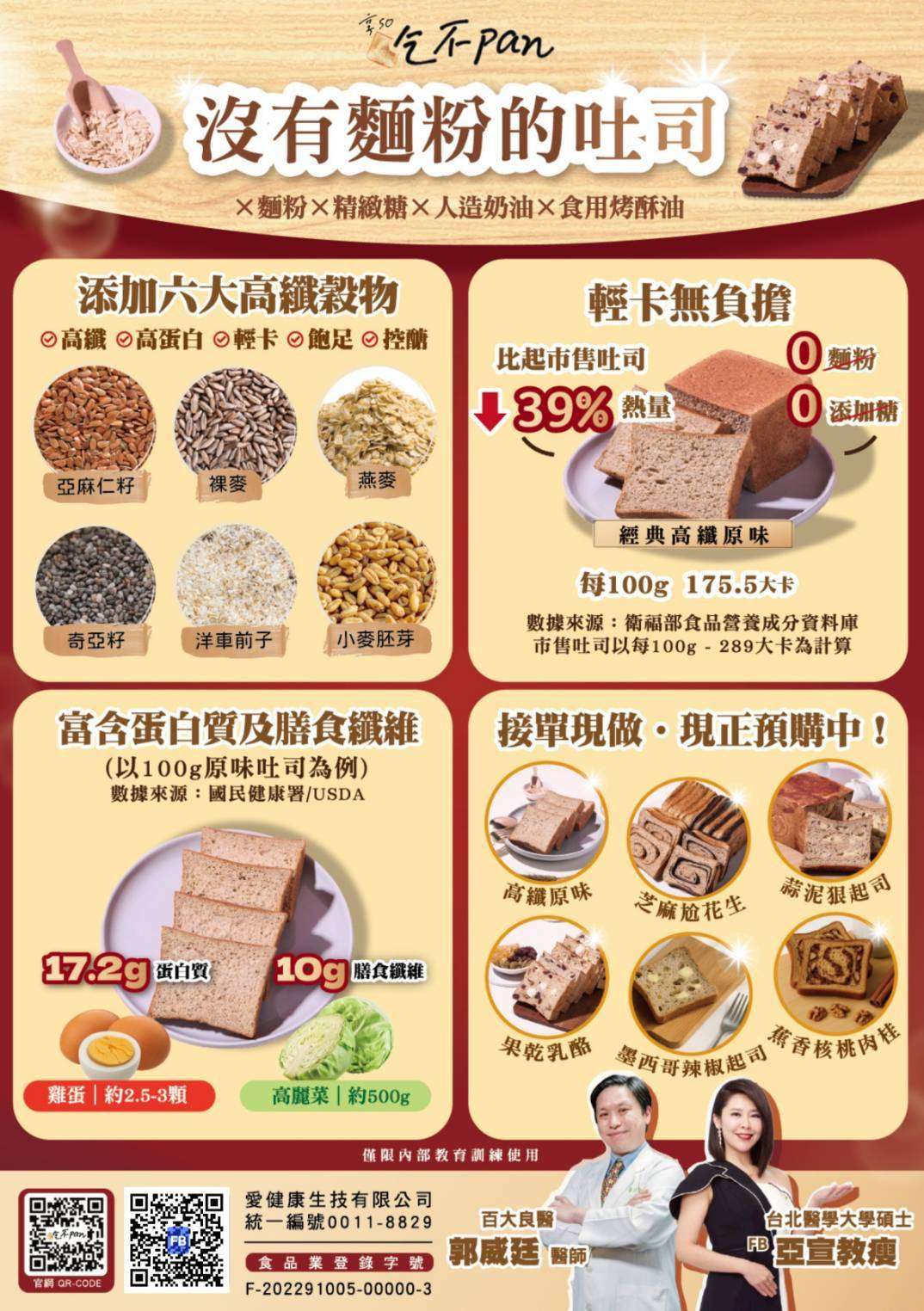吃不pan的吐司以高纖穀物為主成分,經過低溫長時間發酵製程,打造出無麵粉且不礙胃的吐司。吃不pan的吐司擁有迷人的雜糧麵包香氣,兼具吐司的嚼勁與蛋糕的柔軟口感,讓人難以想像它真的不含精緻麵粉與糖。